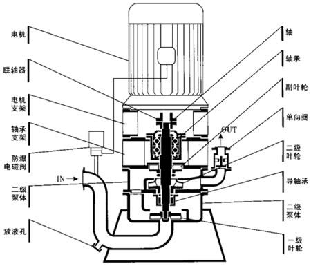 3、泵在正常起动后,叶轮将吸入室所存的液体及吸入管路中的空气一起吸入,液体混合气体在叶轮高速旋转的离心力作用下经导叶抛入气液分离室;